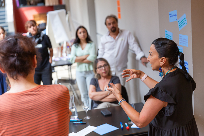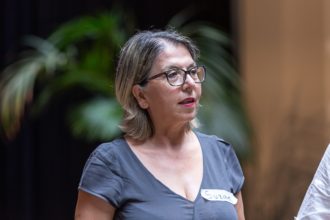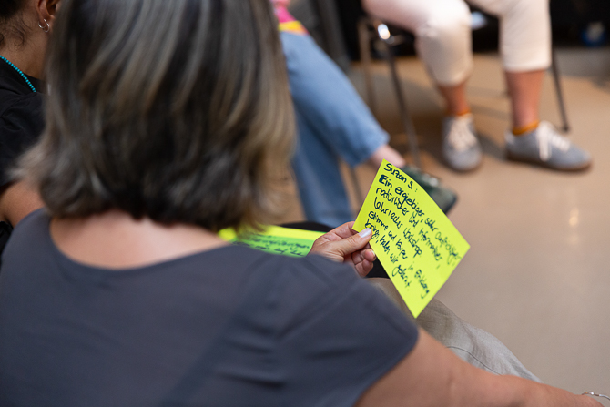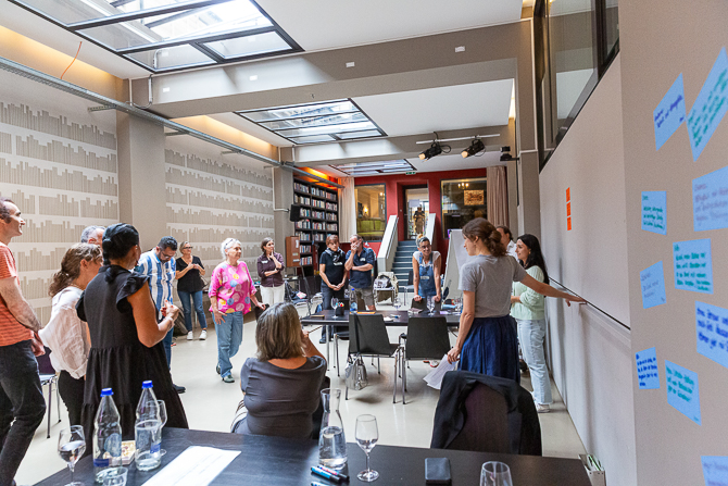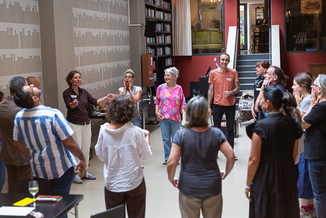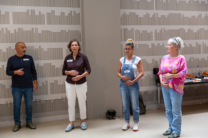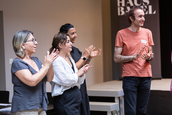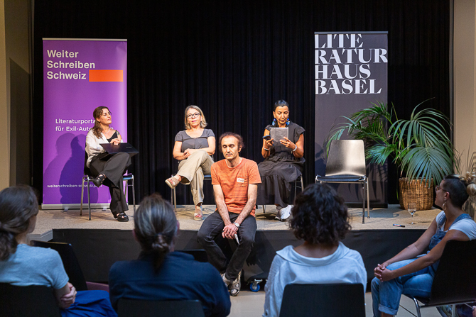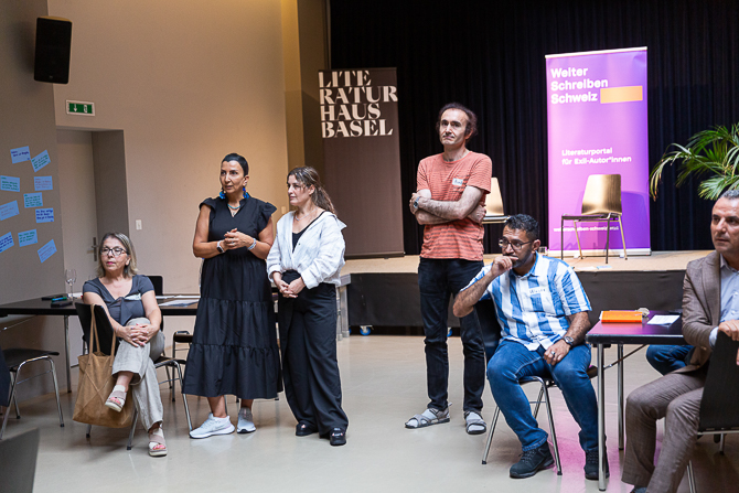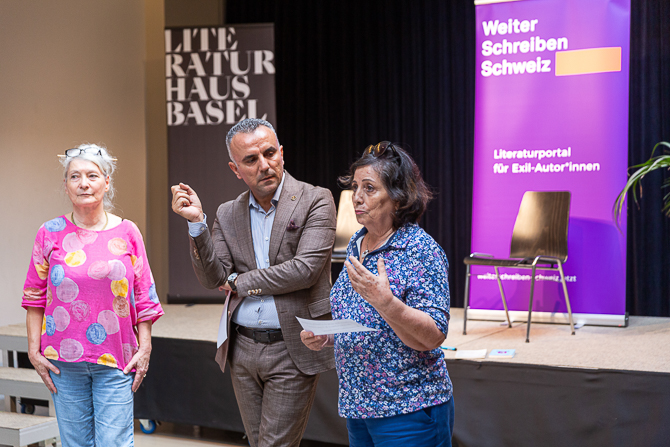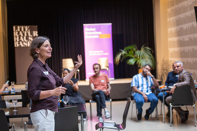 Bereits zum dritten Mal organisierte Weiter Schreiben Schweiz für die am Projekt beteiligten Autor*innen einen Workshop. Dieses Jahr fand er am 5. September im Literaturhaus Basel statt. Liselotte Tännler von der Radioschule klipp+klang und Ariane Zeuner, Sprechtrainerin und Dozentin für Stimme und Rundfunkjournalismus, begannen mit einigen Übungen zur Sprech- und Stimmtechnik. Danach ging es um die Autorenrolle und die Dramaturgie einer Lesung. Der Workshop bot den Teilnehmenden eine gute Gelegenheit, sich persönlich zu treffen, Ideen auszutauschen und Gruppendiskussionen zu führen. Zudem wurden Asiye Tekin, Autorin aus der Türkei, und Daniela Rossi, die Scrivere Ancora Svizzera koordinieren wird, vorgestellt und herzlich begrüsst. Französische, arabische und türkische Übersetzer*innen übersetzten die Veranstaltung simultan.